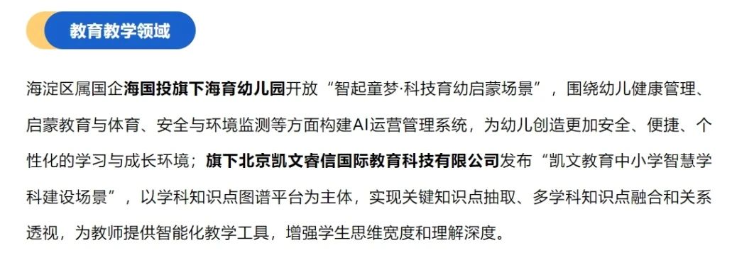 2024 年 9 月 26 日,在 2024 年北京市人工智能應(yīng)用場景聯(lián)合研發(fā)平臺發(fā)布活動(dòng)暨 2024 年北京市人工智能行業(yè)大模型創(chuàng)新應(yīng)用大賽啟動(dòng)儀式上,中關(guān)村科學(xué)城發(fā)布了《人工智能全景賦能首批開放場景榜單》。該榜單面向具身智能、醫(yī)藥健康、教育教學(xué)、文旅消費(fèi)等海淀區(qū)重點(diǎn)產(chǎn)業(yè)和民生領(lǐng)域。